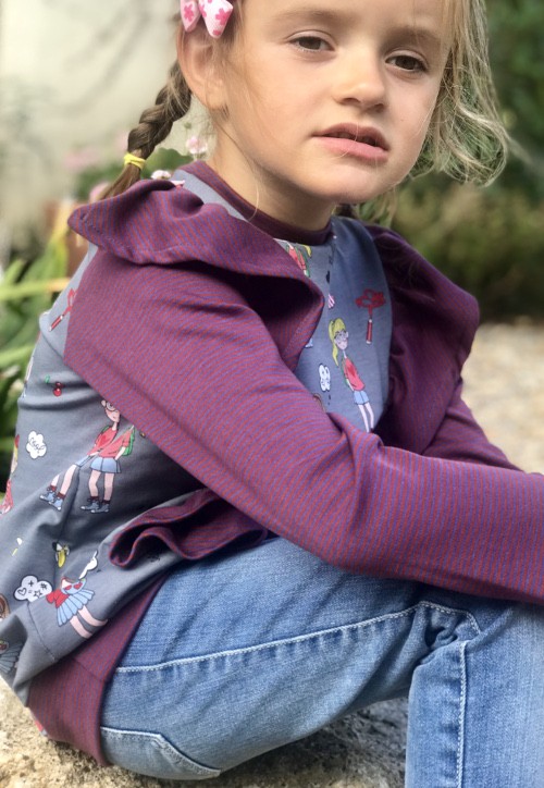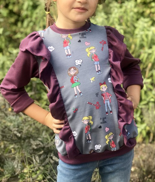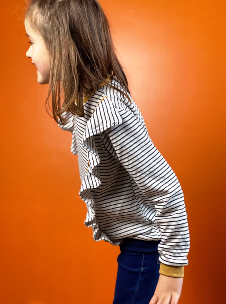 Un top Fillette manches longues avec un volant inséré dans chaque découpe du devant du modèle, avec un dos tout simple pour éviter de charger le style.