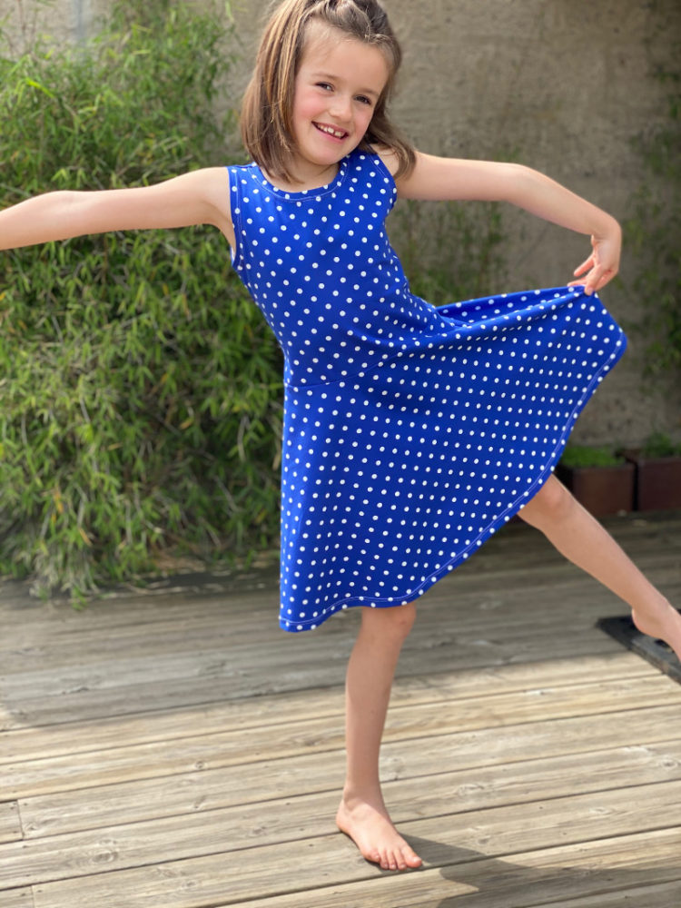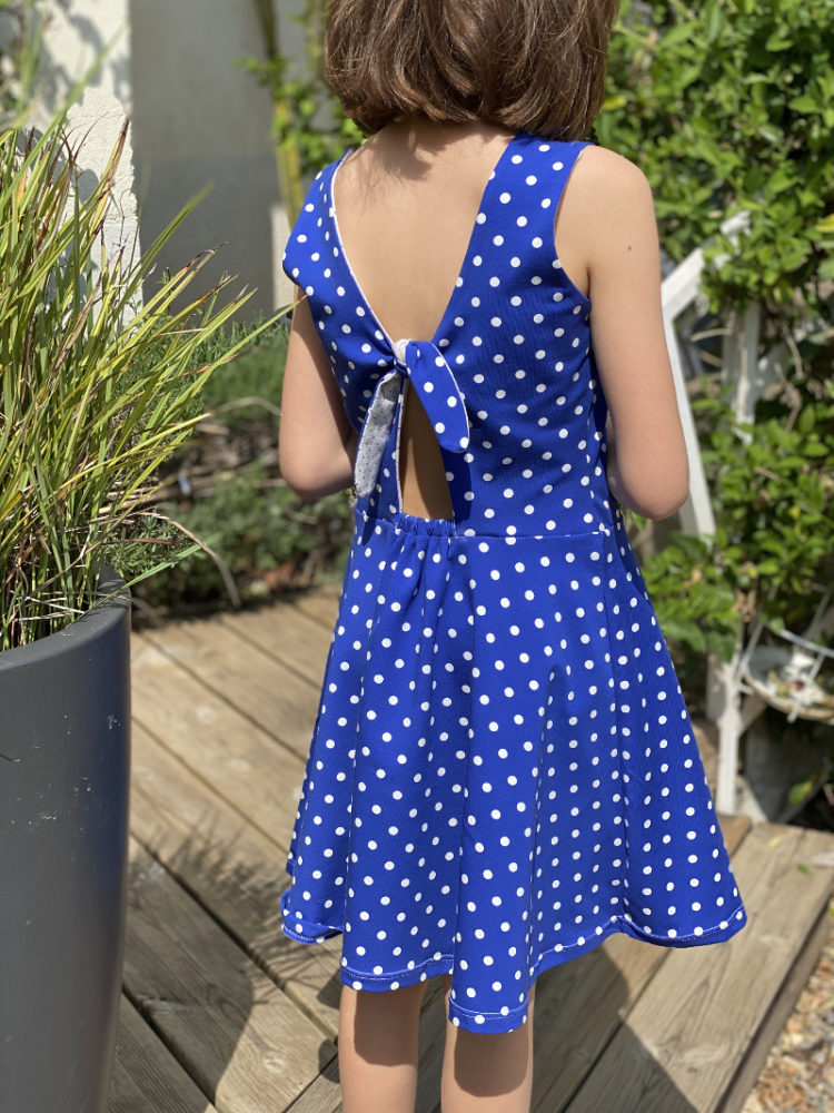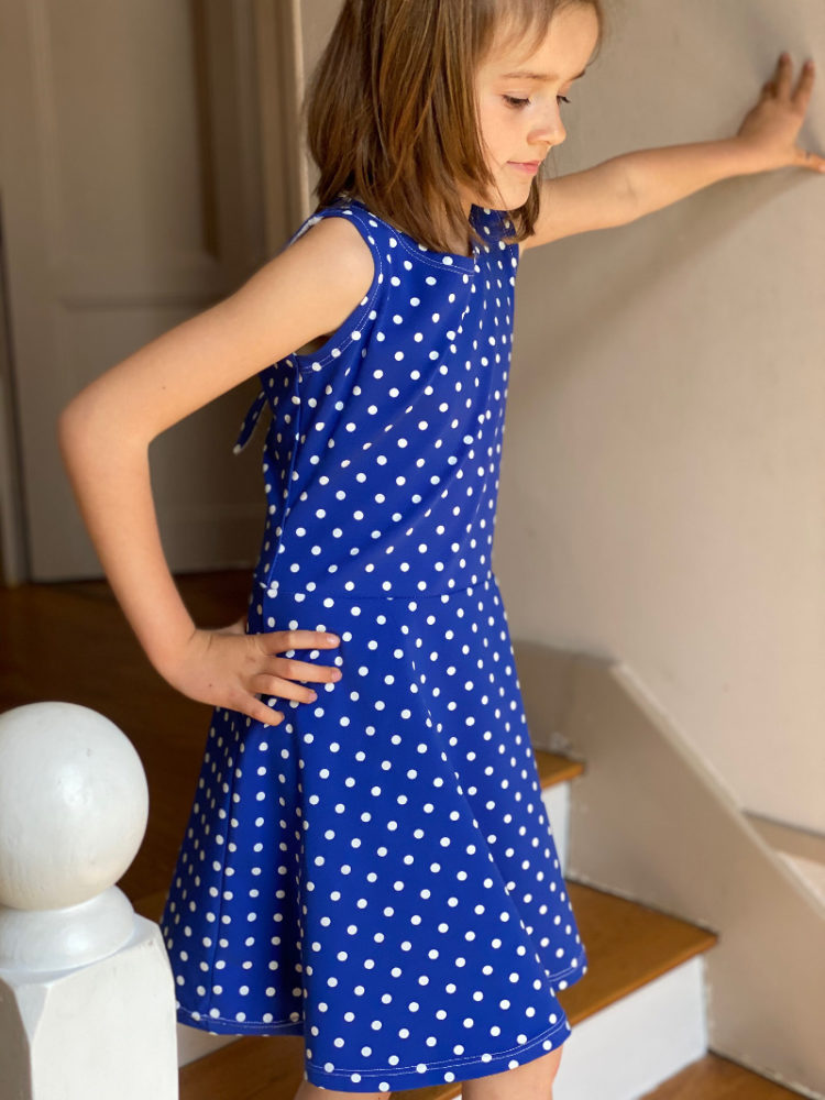 Cette robe  doit être réalisée en maille. Ici un jersey de coton à pois STENZO qui vient de chez Lulu la luciole.