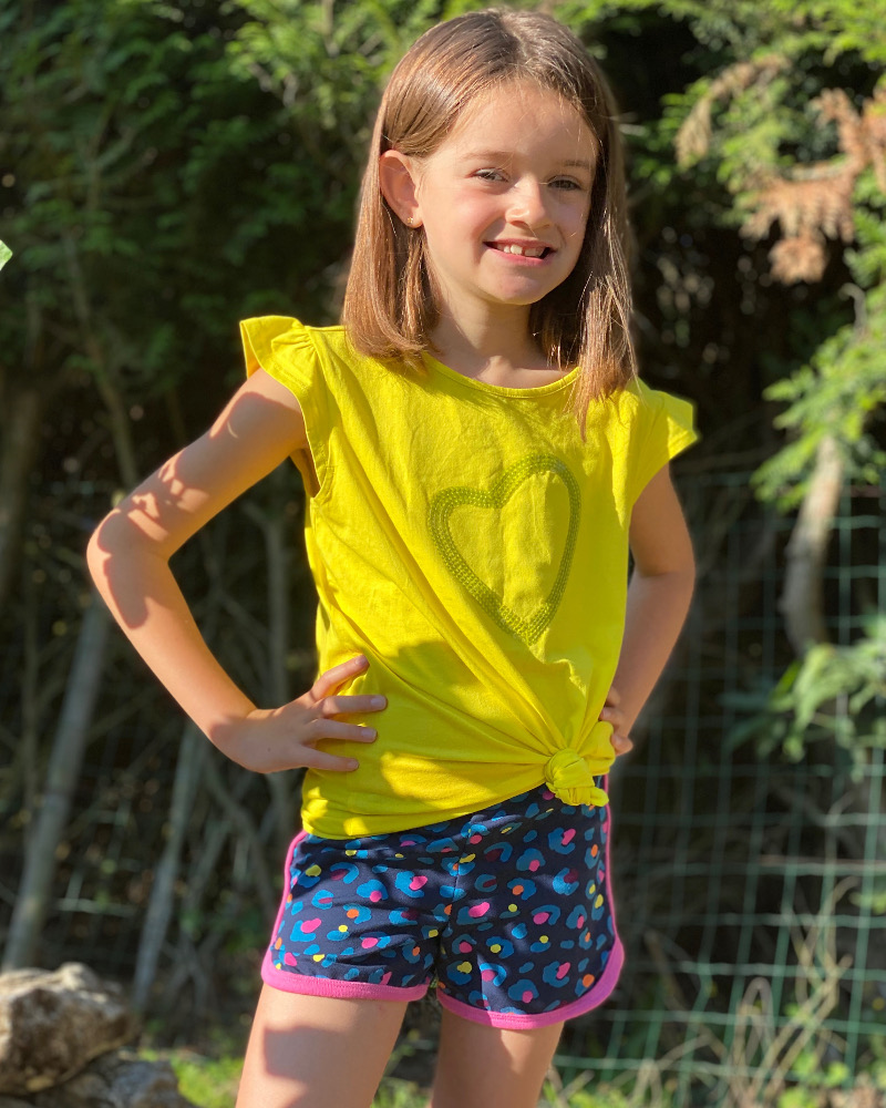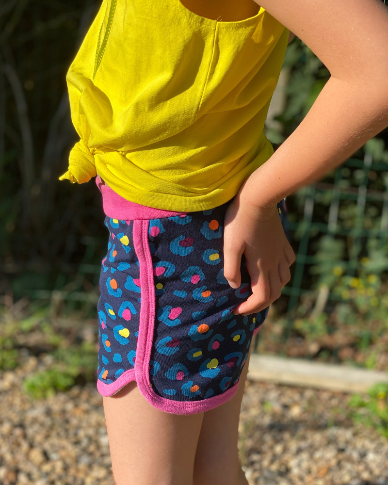 Cette année, j’ai pu coudre ce short NEW MAGIK dans un French Terry imprimé de chez lulu la luciole et il est gansé par un bord côte fuchsia pour lui donner du peps!!