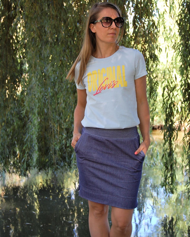 upe femme Moka portée, coupe droite et longueur au genou, réalisée à partir du patron jupe femme facile PDF Moka.