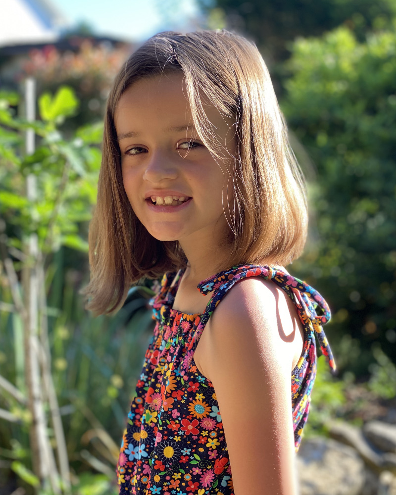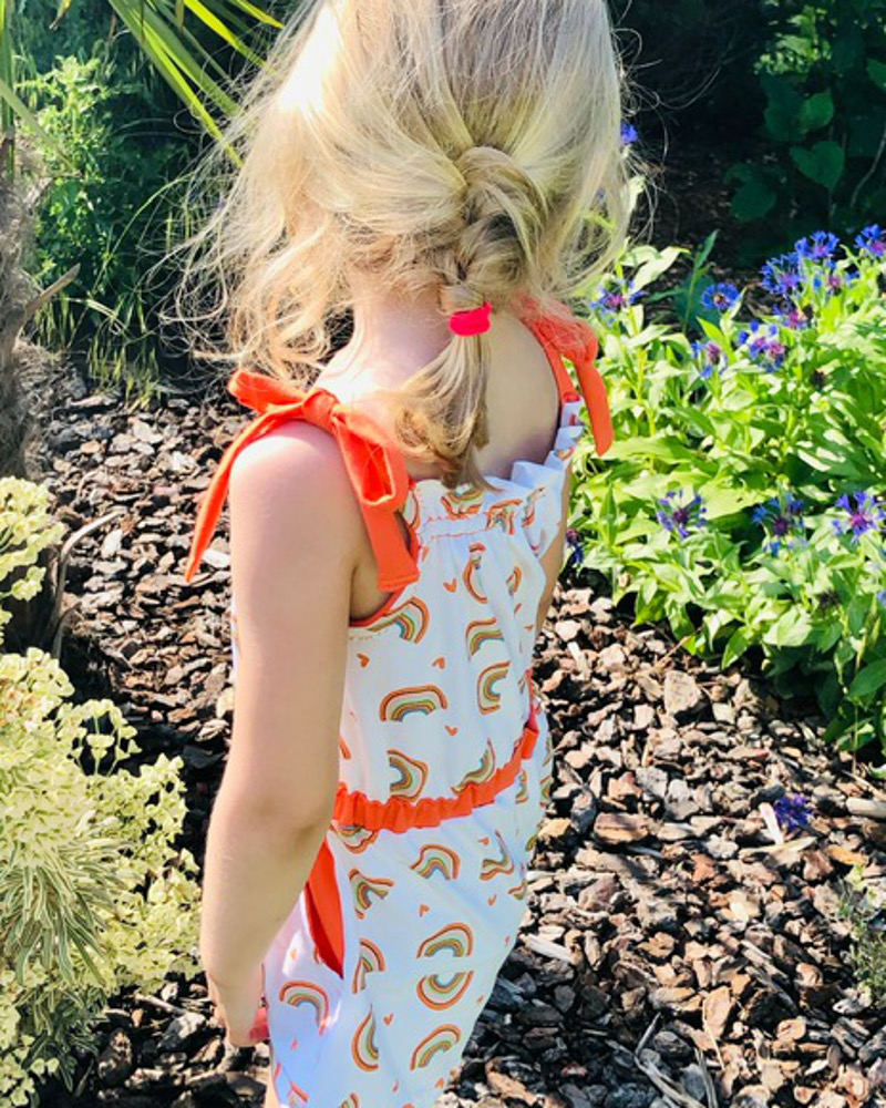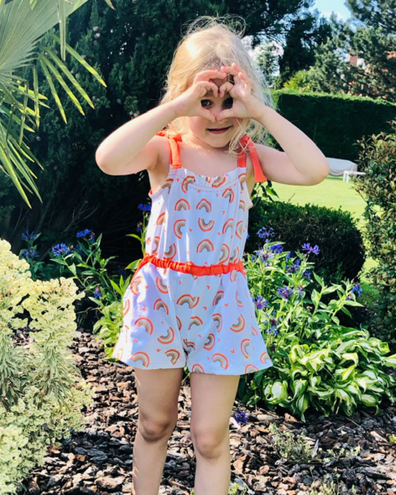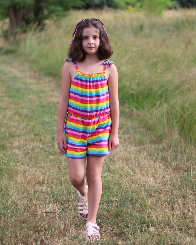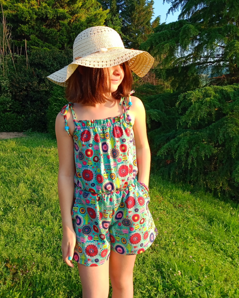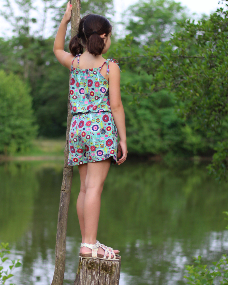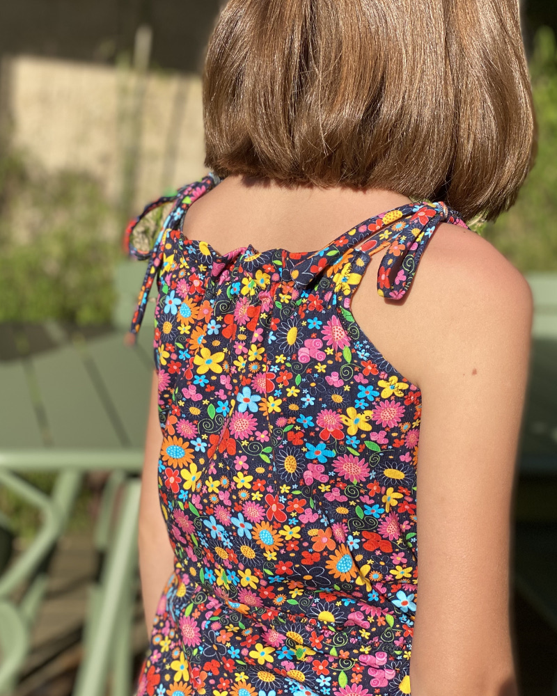 • Haut à bretelles nouées. Mais attention, on noue les bretelles une fois et ensuite la petite ou la grande peut s’habiller sans avoir à dénouer les bretelles. J’ai conçu ce patron pour que les petites soient autonomes.